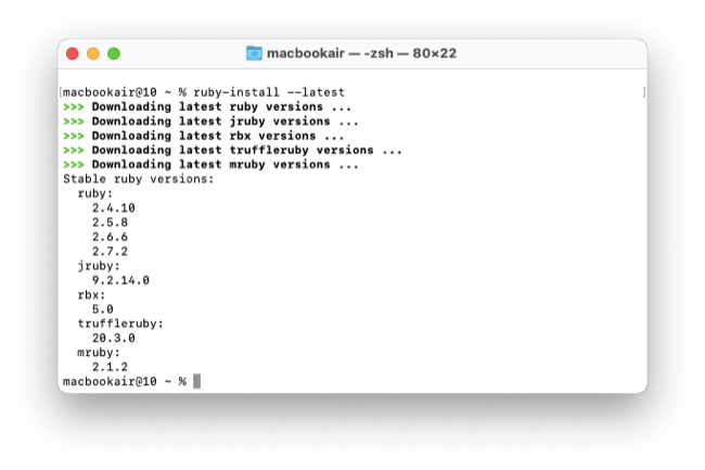 If you are a casual user and won't be using Ruby frequently, you can use Homebrew to install Ruby. See the section, Install Ruby with Homebrew. Most developers should install a software version manager before installing Ruby. It will help you manage multiple versions of Ruby. I recommend asdf. Asdf can manage versions of many languages, including Ruby and Node. Instructions for asdf are in the section, Install Asdf Version Manager.