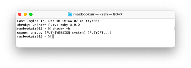 After closing and reopening the Terminal window, use chruby -h to check that Chruby was installed successfully.