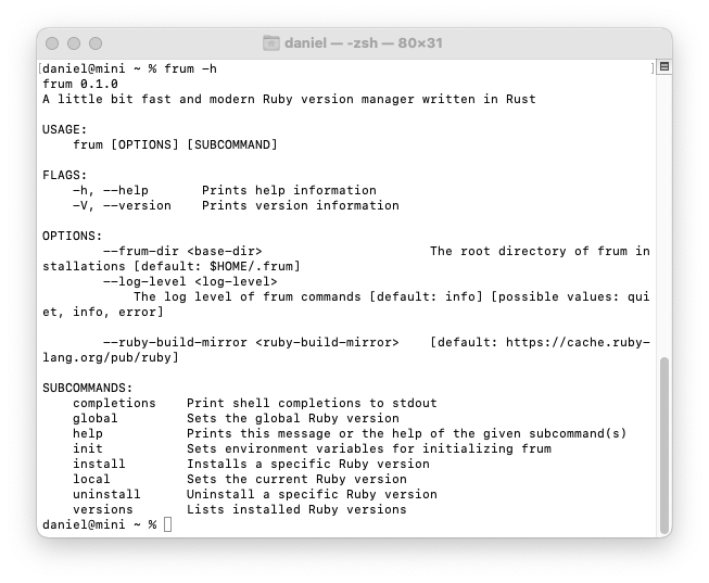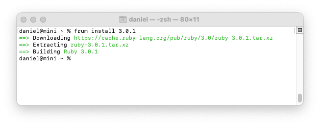 Frum is written in Rust, a good language for fast command line execution of system software. It is new (released in early 2021). Unlike asdf, chruby, or rbenv, it includes a built-in Ruby installer command so there's no extra program needed to install Ruby. The installer is fast and Frum requires no dependencies (it's an all-in-one Rust executable you can install with Homebrew). The Frum version manager is added to your shell to intercept any calls to Ruby. After you install Frum, you must modify your ~/.zshrc file so Frum runs in your local shell environment. Like the other version managers, it checks for a .ruby-version file in a project directory and, if there's no version specified for a project, it will default to a global Ruby version. There are no shims (unlike Asdf or Rbenv) and it doesn't override the cd command (unlike RVM). Though it is new, I recommend it because it's all-in-one and fast.