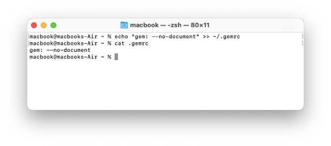 This adds the line gem: --no-document to a hidden .gemrc file in your home directory.