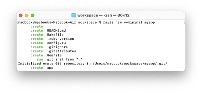 The rails new command generates the default Rails starter app. The option --minimal speeds up creation of a Rails app, leaving out many Rails "extras" that are not needed for a simple application.